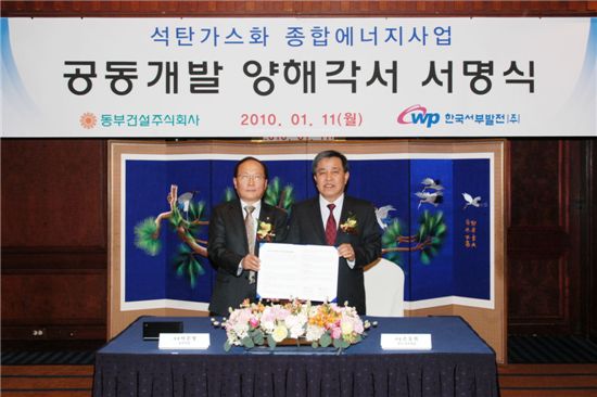 동부건설 이순병 사장(사진 왼쪽)과 한국서부발전 손동희 사장은 11일 석탄가스화 종합에너지사업 공동개발 양해각서를 체결했다.<br /> <br />