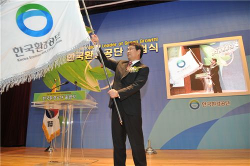 박승환 한국환경공단 이사장이 7일 인천 국립환경인력개발원에서 열린 공단 출범식에서 공단기를 흔들어 보이고 있다. (사진=환경부)