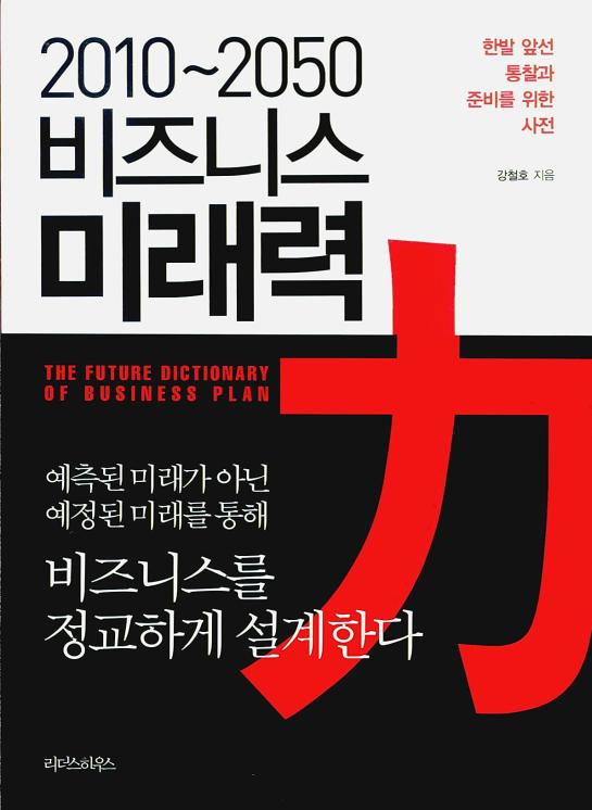 '2010~2050 비즈니스 미래력'강철호 지음/ 리더스하우스 펴냄/ 1만8000원“2010년, ‘매운맛’에서 ‘휴대전화 배터리’까지 50개 분야에 생활표준을 도입한다.”국민 실생활과 밀접한 50개의 생활분야에 상품·양식·제도·서비스 등이 표준화된다.휴대전화를 바꾸고 나면 상이한 입력방식으로 인해 오랜 시간 소비해야 하는 불편함을 덜어줄 휴대전화의 문자입력방식, 식당에서의 1인분의 양, 각 제조회사마다 다른 김치냉장고의 보관용기, 진공청소기의 먼지 봉투 등의 표준화 한다는 내용이다.“2018년, 이순신대교, 마산과 거제를 잇는다.” 2018년 거제도는 더 이상 섬이 아니다. 2010년 12월 거제대교의 완공으로 육지와 섬이 이어지고, 2018년에는 마산과 거제도를 잇는 이순신대교가 건설되면서 섬의 상징적 의미는 사라진다.교량의 건설로 거제 마산 창원 진해 등 인접 도시는 한해 650억 원의 물류 비용을 절감하는 효과가 기대된다. '2010~2050 비즈니스 미래력'은 2010년 올해부터 40년 후까지의 정치·경제·문화·교육 등 사회전반에 대해 연도와 날짜별 사전형식으로 구성하여 예측이 아닌 예정된 미래에 시기 적절한 비즈니스 플랜을 세우는데 도움이 될 것이다. 인터파크도서 박준표 북마스터<ⓒ아시아경제 & 스투닷컴(stoo.com)이 만드는 온오프라인 연예뉴스>