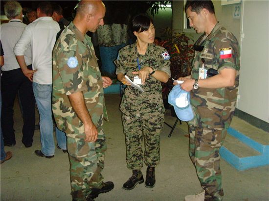 아이티 유엔 평화유지군 군수담당 장교로 파견나가 있는 이선희 소령(가운데)이 평화유지군 관계자와 피해 상황을 확인하고 있다.[사진제공= 합동참모본부]<br />