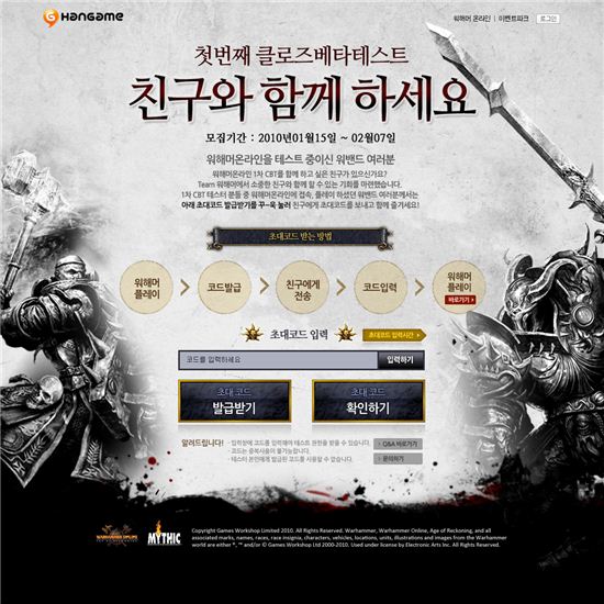 [아시아경제 함정선 기자]NHN(대표 김상헌) 게임포털 한게임은 다중접속역할수행게임(MMORPG) '워해머 온라인: 심판의 시대'가 첫 비공개시범테스트(CBT)에 돌입한다고 15일 밝혔다. 이번 테스트는 오는 2월 7일까지 4주 동안 매 주말마다 진행되며 주마다 각각 다른 미션이 사용자들에게 부과될 예정이다. 1주차에 진행되는 '공개 퀘스트(임무)를 즐겨라' 미션은 각 종족별 초반 지역에서 3가지 공개 퀘스트를 완료 후 스크린샷과 함께 후기를 등록하면 미션을 수행한 사용자 중 추첨을 통해 30명에게 캐릭터 전신을 치장할 수 있는 '풀 세트'아이템을 선물하는 방식으로 진행된다. 2주차 미션은 '길드로 뭉쳐라!'로 6인 이상의 친구를 모아 게임 내 길드를 만들고 이를 소개하는 게시물을 등록, 선별된 길드에는 협동심을 느낄 수 있는 '심홍색 망토' 아이템을 지급하는 내용이다. 한게임은 테스터로 선정된 3000명의 사용자에게 1인당 3명의 친구를 초대해 게임을 함께 즐길 수 있도록 초대권을 제공하는 '친구 초대 이벤트'를 실시하며, 이를 통해 국내 서비스를 위해 업그레이드된 워해머 온라인의 게임 콘텐츠를 보다 많은 사용자들이 체험해 볼 수 있을 것으로 기대하고 있다.