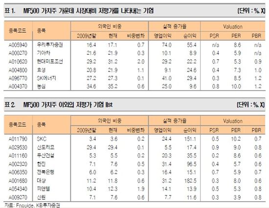 [아시아경제 박선미 기자]2010년 상반기에는 성장주 보다는 가치주 중심의 시장흐름이 전개돼 가치주 투자가 유리하다는 의견이 나왔다.임동민 KB투자증권 애널리스트는 19일 "밸류에이션 측면에서 가치주는 시장이나 성장주 대비 저평가 매력이 여전히 큰 상황이기 때문에 가치주 중심의 포트폴리오 전략이 필요하다"고 조언했다. 2010년 상반기에는 가치주의 아웃퍼폼(Outperform) 가능성이 클 것이라는 판단에 따라 실적개선과 시장대비 저평가를 충족하고, 1월 외국인 비중증가가 진행된 기업들에 관심을 가질 필요가 있다는 분석이다.임 애널리스트는 우선 MF500 가치주 가운데 2010년 실적개선과 시장대비 저평가 (2010년 예상 PSR, PER, PBR), 2010년 1월 현재까지 외국인 비중이 증가한 기업들을 선별했다. 우리투자증권 기아차 현대미포조선 효성 SK에너지 농심 등이다.또 MF500 가치주에 포함돼 있지는 않으나 같은 기준을 만족하고 저평가 된 기업 SKC 신도리코 두산건설 한진 전북은행 대상 피앤텔 신원 등을 꼽으며 "가치주 중심의 포트폴리오 구축에 있어 우선적으로 주목해야 할 대상"이라고 밝혔다. 그는 최근 기업들이 2010년에 공격적인 투자계획을 발표하면서 이것이 성장주의 추가상승 모멘텀으로 작용할 가능성이 있다는 일부 의견에 대해 "아직까지 국내 설비투자상황은 정상화되지 못했고, 최근 나타나는 가파른 증가세는 기저효과에 따른 영향이 크다"며 성장주 보다는 가치주를 외쳤다. 또 "설비투자 증가는 장기적인 기업가치 향상에는 긍정적 요인이 될 수 있으나, 단기적인 실적흐름에는 부정적으로 작용할 가능성도 있음을 감안해야 할 것"이라고 덧붙였다.박선미 기자 psm82@asiae.co.kr<ⓒ세계를 보는 창 경제를 보는 눈, 아시아경제(www.asiae.co.kr) 무단전재 배포금지>