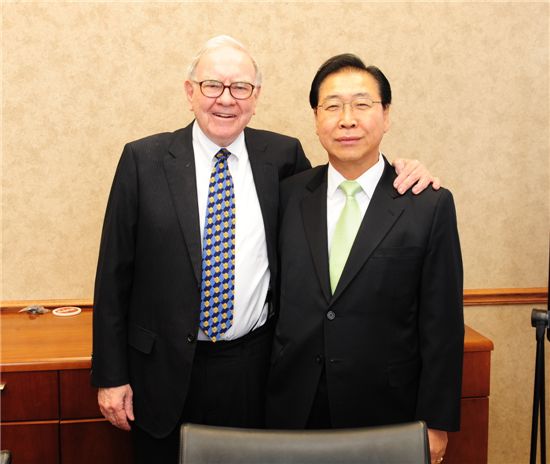 워런버핏 버크셔 해서웨이 회장과 정준양 포스코 회장이 18일(현지시각) 오마하 버크셔 헤서웨이 본사에서 환담을 나눈 뒤 기념촬영하고 있다.<br />