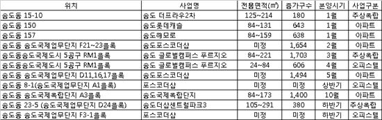 첨단산업클러스터지구에는 첨단바이오단지와 테크노파크, 사이언스 빌리지 등이 들어선다. 특히 이곳에 조성되는 글로벌대학캠퍼스는 미국 뉴욕주립대, 노스캐롤라이나주립대, 델라웨이대 등 외국대학 분교를 유치해 학부 및 대학원 프로그램을 운영한다. 올 하반기부터 개교를 시작해 2012년 하반기까지 조지아공대, 듀크대 등 12개 학교가 문을 연다. 수용 학생수만 1만2000명에 달한다.올해 송도에서 가장 많은 아파트를 분양하는 포스코건설은 오는 2월 국제업무단지 F21~23블록에 '송도 포스코 더샵' 1654가구를 분양한다. 5월께는 D11, 16, 17블록에 1494가구를 공급할 예정이다. 분양가상한제가 부분적으로 손질되고 양도소득세 한시감면 혜택 종료(2월11일까지) 시점 등을 감안했을때 2월 분양물량은 미뤄질 가능성이 크다. 포스코건설은 이외에도 A1블록과 F3-1블록에 '포스코 더샵' 오피스텔을, D24블록에 '송도 더샵 센트럴파크3' 주상복합을 각각 분양할 예정이다.