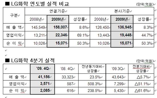 [아시아경제 김혜원 기자] LG화학이 지난해 사상 최대 경영 실적을 냈다. 창사 이래 처음으로 영업이익 2조원을 돌파했다.LG화학(대표 김반석)은 29일 여의도 한국거래소에서 김반석 부회장 주재로 기업설명회를 갖고 연결 기준 ▲매출 15조8007억원 ▲영업이익 2조2346억원 ▲순이익 1조5071억원의 2009년도 경영 실적을 발표했다. 지난해 대비 각각 8.6%, 69.1%, 50.3% 증가한 규모다.자회사와 해외 법인을 제외한 본사 기준으로는 ▲매출 13조6945억원 ▲영업이익 1조9448억원 ▲순이익 1조5071억원의 실적을 달성했다.김반석 부회장은 "정보전자소재 부문에서 LCD용 편광판 세계 1위 달성으로 독보적인 시장 지위를 확보했고 메이저 고객에 대한 소형전지 공급 물량이 늘어나는 등 매출과 영업이익의 대폭적인 개선이 가능했다"고 밝혔다.김 부회장은 이어 "석유화학 부문에서는 고부가 제품 비중 확대, 에너지 절감 활동 등 원가 경쟁력 강화를 위한 내부적인 노력과 더불어 전반적인 수요 회복, 환율 효과 등에 따른 시황 호조도 이어져 전년 대비 영업이익이 급증하는 탁월한 수익을 실현했다"고 설명했다.부문 별로 정보전자소재는 매출 4조1973억원, 영업이익 5693억원으로 전년 대비 각각 56.7%, 22.1% 증가했다. 석유화학 부문은 매출 11조5167억원, 영업이익 1조6738억원을 기록했다. 매출은 2.5% 감소한 반면 영업이익은 83.6% 증가한 규모다.지난 4ㆍ4분기 매출은 4조1156억원, 영업이익은 3571억원, 순이익은 2085억원을 달성했다. 전년 동기 대비 각각 23.5%, 508.3%, 238.5% 급증한 수치다. 하지만 계절적 요인과 성과급 등 일회성 비용 증가로 전분기 대비로는 각각 5.7%, 51.1%, 61.6% 감소했다.올해 매출 목표는 지난해 보다 4.7% 늘어난 16조3000억원으로 잡았다. 시설 투자(CAPEX)는 전년 대비 38.5% 증가한 1조4300억원을 집행할 계획이다. 정보전자소재 부문의 편광판 증설, LCD용 유리기판 및 전기자동차용 배터리 공장 건설과 석유화학 부문 여수 NCC 10만t 증설 등을 위해 투자할 예정이다.구체적으로 정보전자소재 부문에서는 ▲편광판 사업 세계 시장점유율 1위의 확고한 유지 ▲감광재, 전해액 증설 등을 통한 전자재료 사업의 강화 ▲소형전지의 글로벌 전략 고객 점유율 확대 ▲중대형전지 분야의 글로벌 고객사 추가 확보 등을 통한 확고한 일등 지위 확보에 주력할 계획이다.석유화학 부문은 최고의 수익성을 달성한다는 방침 아래 ▲여수 NCC 10만t 증설 등으로 국내 사업의 규모 확대 및 경쟁력 강화 ▲고부가 프리미엄 제품 비중 확대(ABS 71%, PE 73%) ▲에너지 원단위 및 원부재료 절감을 통한 원가 경쟁력 강화 등을 추진한다는 방침이다.김 부회장은 올해 사업 계획과 관련해 "중국의 견조한 성장세 지속 등 전반적인 경기 회복이 이뤄질 것으로 예상되나 지난해에 비해 환율이 큰 폭으로 하락하고 세계 경기의 불확실성도 여전히 존재해 어떤 상황에서도 탁월한 성과를 창출할 수 있는 탄탄한 사업 경쟁력을 갖추는데 주력할 것"이라고 말했다.그는 "특히 전기자동차용 배터리는 안정적인 양산 체제 구축은 물론 R&D 분야에도 집중 투자를 단행해 세계 1위 지위를 더욱 확고히 하고 LCD용 유리기판은 최단 기간 내 최고의 양산 기술을 확보하는 등 미래 신사업 육성에도 투자를 아끼지 않을 것"이라고 덧붙였다.김혜원 기자 kimhye@asiae.co.kr<ⓒ세계를 보는 창 경제를 보는 눈, 아시아경제(www.asiae.co.kr) 무단전재 배포금지>