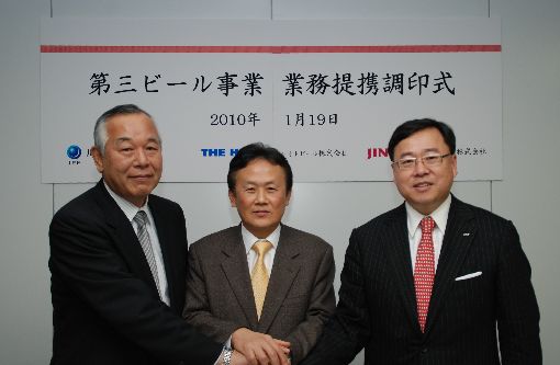 하이트맥주는 일본 수출을 강화하기 위해 최근 진로재팬, 카와쇼푸드사와 업무제휴를 맺었다.양인집 진로재팬 사장, 이남수 하이트-진로그룹 전무, 요네다 코헤이 카와쇼푸드 사장(오른쪽부터)이 기념촬영을 하고 있다.