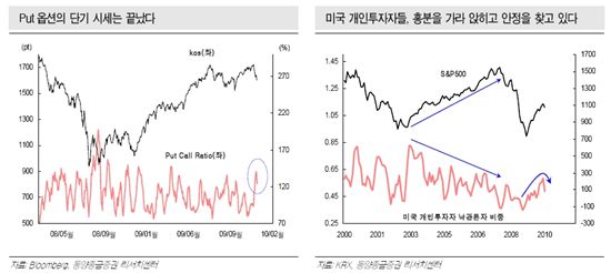 [아시아경제 김지은 기자] 입춘을 불과 이틀 앞두고 있는데 날씨는 또다시 추워졌다. 봄이 문턱까지 찾아왔지만, 매서운 겨울바람이 아직은 때가 아니라며 심술을 부리는 모양이다. 겨울바람의 심술이 언제까지 이어질지는 아무도 모르지만, 한가지 분명한 것은 입춘이 지나면 서서히 봄의 따스한 기운이 강해지며 겨울바람을 밀어낼 수 있다는 점이다. 주식시장 역시 아직도 찬바람이 분다. 전날 0.2%의 소폭 반등에 성공하긴 했지만, 그간 급락한 것에 비하면 반등이라는 표현이 부끄러울 정도다. 주식시장의 찬바람이 언제까지 이어질지 모르지만 분명한 것은 최악의 추위는 지나갔다는 점이다. 물론 봄이 오더라도 꽃샘추위가 재차 기승을 부리는 등 변덕스러운 날씨가 이어질 수 있지만 일단 기술적 반등의 가능성은 크게 높아진 모습이다.지난 밤 뉴욕증시가 강하게 반등했다. 미국의 1월 ISM 제조업지수가 2004년 8월 이후 가장 높은 수준으로 올라서며 경기회복에 대한 안도감을 제공한 것이 호재로 작용했다. 국내증시의 수급 행방이 여전히 오리무중인 가운데 글로벌 증시의 영향을 크게 받고 있는 만큼 이날은 미 증시의 강세를 발판으로 삼으며 국내증시 역시 반등에 나설 수 있을 것으로 기대된다. 글로벌 증시의 안정적인 흐름 뿐 아니라 내부적으로도 긍정적인 흐름은 일부 엿보인다. 대표적인 것이 삼성전자의 주가 흐름이다. 코스피 지수는 전날 장중 내내 반등을 시도하는 모습을 보였지만 삼성전자는 그렇지 못했다. 장 중 76만50000원까지 내려앉으면서 120일 이동평균선을 하회하기도 했다. 120일선을 하회한 것은 지난해 3월 코스피 지수가 본격적인 반등에 나선 이후 11월말 두바이 사태가 유일했다. 이 당시에도 120일선을 하회한 후 단 하루만에 120일선 위로 올라서면서 안정적인 흐름으로 이어진 바 있다. 그만큼 120일선의 지지 여부가 전체 주가흐름에 있어 중요한 변수라는 얘기도 된다. 전날 삼성전자 역시 장중 120일선을 하향이탈했지만, 이내 낙폭을 줄이며 120일선의 지지력이 확보되는 모습을 보였다. 물론 아직까지 5일 이평선을 비롯해 10일ㆍ20일선이 모두 우하향 곡선을 그리고 있는 만큼 재차 120일선을 무너뜨릴 가능성도 배제할 수 없지만, 일단 전날 1차적인 지지에 성공했고, 이날도 미 증시가 1% 이상 반등했고 필라델피아 반도체지수가 3% 이상 급등한 만큼 삼성전자의 반등을 기대할 수 있는 상황이다. 선물시장에서의 미결제약정이 감소했다는 점도 주목할 만 하다. 최근 4거래일 연속 4600계약이 감소했는데, 이는 그만큼 지수 하락을 예상하는 투자심리도 약해졌다는 의미가 된다. 여기에 옵션시장에서도 시장의 하락 기대 심리가 약해진 것을 확인할 수 있다. 동양종금증권에 따르면, PCR(Put Call Ratio) 지표가 고점을 확인하고 하락 반전한 것을 확인할 수 있다. PCR은 Put 옵션 거래대금을 Call 옵션 거래대금으로 나누어 구하는데, PCR 값이 크다는 것은 Put 옵션 거래대금이 그만큼 많음을 의미하고, 이는 시장의 하락 기대 심리가 강하다는 뜻이 된다. 최근 PCR이 하락 반전세를 보이고 있는 만큼 시장의 하락을 예상하는 심리 역시 약해졌다는 뜻으로 해석할 수 있다.