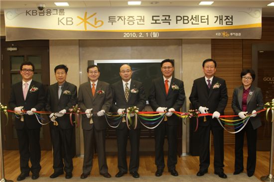 KB투자증권(사장 김명한)은 KB국민은행 도곡PB센터(Gold & Wise)내에 2호 영업점을 오픈하고 2일부터 본격적인 영업을 시작했다. 사진 왼쪽부터 김용선 도곡 BIB지점장, 김재명 고객, KB금융지주 최인규 부사장, KB투자증권 김명한 사장, KB국민은행 김욱일 본부장, 정호운 고객, 윤설희 KB국민은행 도곡PB센터장이 테잎컷팅을 하고 있다. <br />