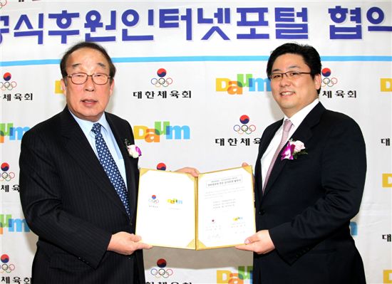 4일 다음 최세훈 대표(오른쪽)와 대한체육회 박용성 회장(왼쪽)이 송파구 대한체육회에서 공식 후원 협약을 체결하고 기념촬영을 하고 있다.