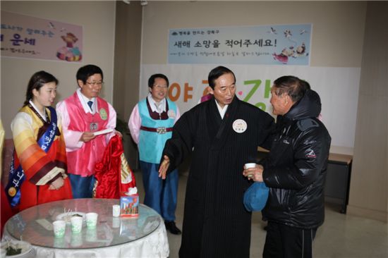 [아시아경제 박종일 기자]김현풍 강북구청장을 비롯 강북구 간부들이 경인년 새해를 맞아 주민들에게 새해 인사를 드린다. 강북구(구청장 김현풍)는 16일 오전 10시 강북구청 본관 입구에서 '새해 고객맞이 행사'를 개최한다.이번 행사는 구민들과 구청을 찾는 고객분들에게 경인년 새해 인사를 드리며 한 해 안녕과 행복을 기원하는 자리로 특히 구청 4급 이상 간부들이 참여해 섬김의 리더십을 직접 실천하고 고객 감동 행정 의지를 다지는 계기가 될 것으로 기대하고 있다. 행사는 설 연휴 이후 첫 근무일인 16일 오전 10시부터 1시간동안 진행되며 김현풍 강북구청장과 4급이상 간부들이 함께 한다. 참여자들은 한복을 갖춰 입고 구청을 찾아온 모든 고객 분들께 일일이 새해인사와 덕담을 드리게된다. 구정에 대한 시민들의 의견도 듣는다.