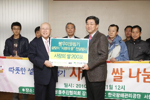 [아시아경제 이경호 기자]한국광해관리공단(이사장 이이재)은 인간성회복운동 추진협의회(총재 이윤구)에 11일 설을 맞아 불우이웃을 위해 10㎏짜리 쌀 200포를 전달했다. 이경호 기자 gungho@asiae.co.kr<ⓒ세계를 보는 창 경제를 보는 눈, 아시아경제(www.asiae.co.kr) 무단전재 배포금지>