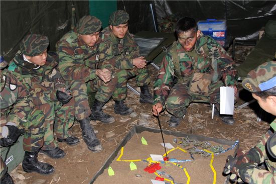 지휘통제실안에서는 김봉수 중대장(대위ㆍ3사 40기)이 실제지형의 축소 모래판을 보며 "내일 아침 05시 보병들이 고지에 올라 교란 등 작전을 수행할때 시간차를 두고 공격한다"고 소대장들에게 지시하고 있었다.