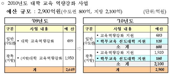 [아시아경제 김도형 기자]교육과학기술부는 대학 학부 교육의 질을 높이기 위한 ‘대학 교육역량강화 사업’에 올해 2900억원을 투입하기로 했다. 교과부는 ‘대학 교육역량강화 사업’ 2010년도 기본계획을 확정해 17일 공고했다. 올해 계획에서는 지난해에 비해 251억원이 늘어난 2900억원이 배정됐다. 또 지표 개선을 통해 대학의 등록금 인상률 등을 지원에 반영하기로 했다.◇ 대학별 집중 지원 제도 신설 = 2010년도 계획의 가장 큰 특징은 ‘학부교육 선진화 선도대학 지원 사업’ 신설로 인해 사업예산이 두 방향으로 갈라져서 투입된다는 점이다.신설되는 ‘학부교육 선진화 선도대학 지원 사업’을 통해 교과부는 ‘잘 가르치는 대학’ 10개교 내외를 선정하고 학교당 30억원씩 총 300억원을 지원하게 된다. 교과부는 선도대학 지원 사업을 통해 대학들이 학생을 ‘잘 뽑는 경쟁’에서 ‘잘 가르치는 경쟁’으로 전환할 것을 기대하고 있다고 밝혔다.◇ 등록금 인상률·취업률 등 반영해 지원 = 한편, 교육여건과 성과를 반영한 핵심지표를 통해 지원대학을 선정, 대학을 지원하는 ‘교육역량강화 지원 사업’은 2600억원 규모로 계속 추진된다.교육역량강화 지원 사업의 경우 지원대학 선정을 위한 지표를 개선해 더 정확한 평가를 바탕으로 대학을 지원하기로 했다.취업률의 경우 건강보험 데이터베이스를 통해 검증된 취업률만을 활용해 취업률 부풀리기를 사전에 차단하게 된다. 국제화 지표에서도 단순히 재학 중인 외국인이 아니라 학위과정을 수료한 외국인 졸업생 비율을 활용하도록 했다.또 장학금 지급률은 정부와 지방자치단체에서 지원되는 지급액은 제외하고 교내 자체 재원과 기부금 등만을 반영하기로 했다.특히 교과부는 최근 2년의 등록금 인상률과 인상액을 동시에 고려한 등록금 인상 수준을 평가지표에 추가해 대학의 등록금 인상을 억제하기로 했다.이에 따라 교육역량강화 지원 사업은 총 8개 지표와 지표별 향상도를 반영해 지원대학을 선정하고 수도권대학에 680억원, 그 외 지역 소재 대학에 1920억원을 지원하게 된다.
