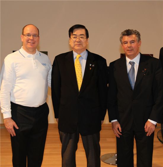 조양호 한진그룹 회장(중앙)이 17일 국제 비영리 단체인 '피스 앤 스포츠' 대사로 임명된 후 단체 후원인이면서 모나코 국왕인 알베르 2세(왼쪽) 및 조엘 브주 피스 앤 스포츠 회장(오른쪽)과 기념사진을 촬영하고 있다.