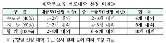 [아시아경제 김도형 기자] 교육과학기술부가 ‘잘 가르치는 대학’ 10곳을 선정해 올해 30억원씩 지원하기로 했다. 교과부의 중간 평가를 거치지만 선정된 대학은 기본적으로 4년 동안 120억원을 지원받게 된다.◇ 학부중심으로 다년간 집중지원 = 교과부는 17일 ‘2010년도 대학 교육역량강화 사업’의 기본계획을 발표하면서 제도 신설을 통해 ‘잘 가르치는 대학’을 집중 지원하겠다고 밝혔다. ‘학부교육 선진화 선도대학 지원 사업’으로 올해 총 300억원의 예산이 투입된다.신설 지원 방안은 기존에 실시되던 ‘교육역량강화 지원’과는 큰 차이를 보인다. 기존의 사업은 학부 역량 강화를 위한 폭넓은 기반 조성이 목적인 반면에 ‘학부 선진화 지원’ 사업은 선정된 학교에 대한 집중적인 지원을 실시한다. 실제로 ‘교육역량강화 지원’은 전체 199개 4년제 대학의 45%에 해당하는 90개 내외의 대학에 이루어지고 있지만 ‘학부 선진화 지원’을 받는 10개교는 전체 대학의 5%에 불과하다.또 교육역량강화 지원은 매년 지원 대학을 선정하는데 반해 ‘학부 선진화 지원 사업’은 지정된 학교를 4년 동안 지원하게 된다. 안정적인 지원을 위해서다. ‘학부 선진화 지원 사업’은 그 밖에도 대학원을 제외한 학부교육을 중점적으로 평가하고 지원도 학부교육 체계 개선을 중심으로 이루어지는 등의 특징을 가지고 있다.◇ 대학 유형 나누고 종합적으로 고려해 결정 = ‘학부 선진화 지원’의 대학 선정과 관련해 교과부는 학부교육의 선진화라는 기준을 제시했다. 사업목적도 ‘특색있고 경쟁력 있는 다양한 학부교육 선진 모델 창출’ 등으로 명시했다.이에 따라 교과부는 기본적인 교육 여건은 물론 교육과정의 구성과 운영, 교육 지원 시스템 등과 앞으로의 선진화 계획을 종합적으로 고려하겠다고 밝혔다. 교과부는 학부교육 선진화의 예시로 학부교육을 통한 기초·소양교육 강화, 학부중심의 교육 체제 구축, 진로 및 취업 특성화 교육 등을 제시했다.한편 지원대학은 소재지와 대학 규모 등으로 유형을 구분해 선정하게 된다. 대학을 수도권과 지방, 대규모와 중·소규모(재학생 1만명 기준)로 구분해 선정한다.
