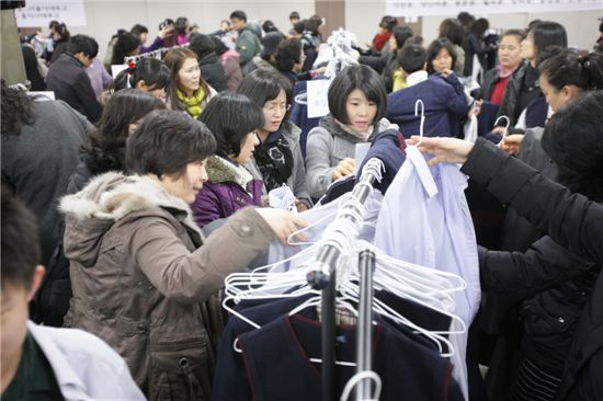 [아시아경제 박종일 기자]성북구(구청장 서찬교)가 19∼20일 오전 10시부터 오후 6시까지 구청 지하1층 다목적홀에서 개최한 교복물려주기 알뜰장터가 성황을 이뤘다.이번 알뜰장터는 개장시간 전부터 판매장을 찾은 학생들을 위해 번호표까지 마련한 뒤 한 번에 일정한 인원씩만 들여보내야 했을 정도로 절약정신이 빛난 행사였다는 평가를 받았다.이 곳에서는 성북구 내 26개 중고등학교의 교복이 1벌당 2000 원에, 또 상의나 하의, 조끼, 셔츠 등은 1점당 1000 원씩에 판매됐다.