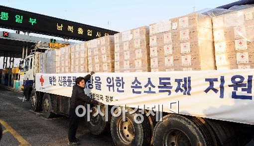 [아시아경제 이재문 기자] 정부가 신종인플루엔자 관련 대북 지원의 일환으로 10억원 총 20만ℓ로 25t 트럭 25대 분량 상당의 손 소독제를 북한에 보낸다. 23일 오전 경기도 도라산 남북출입국사무소에서 관계자들이 신종플루예방 손 소독제를 실은 차량을 점검 하고 있다. 이재문 기자 moon@asiae.co.kr<ⓒ세계를 보는 창 경제를 보는 눈, 아시아경제(www.asiae.co.kr) 무단전재 배포금지>