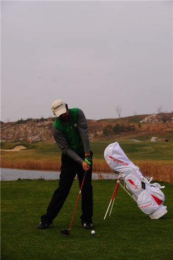 [사진] 임팩트 순간 왼쪽 발로 지면을 강하게 차준다는 이미지로 스윙한다.<br />