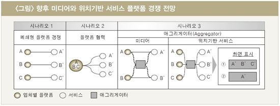 이어 업체간 협력을 통한 플랫폼 개방 방법이 있다고 설명했다. 그러나 일부 기업의 희생이 요구되는 만큼 실현 가능성은 낮은 것으로 평가된다.마지막으로 인터넷의 포털사이트와 같은 다양한 컨텐츠와 서비스를 결합해 제공하는 애그리게이터(Aggregator)가 등장해 문제가 해결될 수 있을 것이라고 내다봤다. 이윤재 기자 gal-run@asiae.co.kr<ⓒ세계를 보는 창 경제를 보는 눈, 아시아경제(www.asiae.co.kr) 무단전재 배포금지>