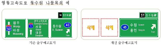 [아시아경제 황준호 기자] 고속도로 표지판이 확 바뀐다. 운행시 불필요하게 난립해있던 직진 정보 표지판을 줄이고 대신 중요한 출구 정보 표지판을 더욱 돋보이게 만든다. 표지판내 글자수도 대폭 줄인다. 3일 한국도로공사는 양재동에 위치한 교육문화회관 가야금 A홀에서 '고속도로 표지체계 개선을 위한 공청회'를 갖고 이 같은 방안을 발표했다.이날 공청회는 지난 2008년부터 한국도로공사와 대한교통학회가 고속도로 표지체계 개선을 위해 수행한 연구 성과에 대해 전문가와 시민들의 의견을 수렴하기 위해 개최됐다.연구 결과에 따르면 직진정보에서 출구정보 안내 중심으로 표지판이 대체된다. 나들목 또는 분기점 2km와 1km 전방에서 제공하던 직진방향 지명을 삭제한다. 이어 출구방향의 지명만을 안내해 운전자가 출구지점을 쉽게 인지할 수 있도록 변경했다.또한 출구지점에서 본선과 출구의 차로별 방향을 지정해 운전자가 주행하고자 하는 차로를 신속하게 판단할 수 있도록 개선했다.현재 노선번호는 화살표 위(on-the-way) 또는 지명 우측에 배치돼 지명안내의 보조적 정보로만 활용되고 있다. 이에 노선번호를 화살표에서 분리하고 지명 좌측에 배치해 정보제공의 우선 순위를 지명보다 상위에 배치했다.출구번호도 '기점으로부터의 거리'에 부여해 출구번호의 활용도를 제고했으며 국문과 영문을 각각 분리 배치하면서 '한길체'로 글자체를 바꿨다. 한길체는 지식경제부에서 도로안내표지판에 쓰기 위해 개발한 서체로 기존 고딕체에 비해 글씨체의 뭉침현상을 방지해 가독성이 향상되고 판독거리가 개선되는 효과가 있다.도로공사는 이같은 내용을 담은 공청회를 통해 국민의견을 수렴하고 이후 시범운영과 설문조사를 통해 개선안을 최종 확정하기로 했다. 이어 '도로표지규칙' 개정을 국토해양부에 건의, 국토부가 이 같은 개선안을 받아들이면 시범사업을 통해 고속도로상의 표지판을 새로운 방식으로 바꿀 계획이다.황준호 기자 rephwang@asiae.co.kr<ⓒ세계를 보는 창 경제를 보는 눈, 아시아경제(www.asiae.co.kr) 무단전재 배포금지>