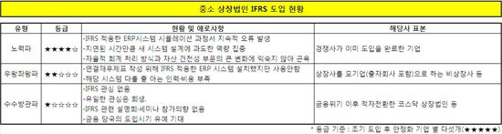 [아시아경제 임선태 기자, 김유리 기자]한국 채택 국제회계기준(K-IFRS) 의무도입을 앞두고 중소 상장기업들의 대응 방안을 보면 일정한 원칙과 기준이 없이 제각각이다. 문제의 심각성을 인지한 일부 기업들만이 발빠른 움직임을 보이고 있고 대부분 IFRS 시스템을 제대로 이해하지 못하고 있는 실정이다. 때문에 금융당국의 지원책도 일방적 교육에서 벗어나 단계별 맞춤형 서비스로 전환돼야 한다는 목소리가 높다.4일 관련업계에 따르면 중소법인들의 IFRS 도입 수준은 2~3년에 걸친 용역 작업에도 불구 아직도 시행착오를 반복하고 있는 '노력파', 모회사의 지원으로 IFRS 시스템을 조기에 도입했지만 인력과 비용의 한계로 신 시스템을 방치하고 있는 '우왕좌왕파', 적자난에 허덕이며 도입 유예 등을 기대하는 '수수방관파'로 나뉘어 고착화되고 있는 상태다.