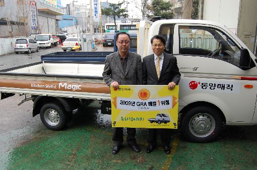 [아시아경제 조인경 기자] 동양매직(대표 염용운)이 자사 가스레인지를 가장 많이 판 거래처에게 트럭을 선물했다.동양매직(대표 염용운)은 지난 4일 대구에 위치한 경북지사에서 2009년 가스레인지 판매량 1등점인 직할거래처 '금강이엔디'에 이색 상품으로 1t 트럭을 증정했다고 5일 밝혔다. 동양매직은 전략적 집중 육성 유통인 직할거래처 가스레인지 판매 확대 차원에서 업계 최초로 이번 시상을 기획했다.금강이엔디는 거래처들의 치열한 경쟁을 뚫고 지난해 가스레인지 매출만 20억원을 기록해 이번 시상의 영예를 안았다. 권유석 금강이엔디 대표는 "배송차량이 낡아 교체를 고민하고 있었는데 때마침 트럭을 받을 수 있는 기회가 생겨 악착같이 가스레인지를 팔았다"며 "앞으로도 이렇게 실용적인 상품이 걸린다면 업체들의 판매경쟁이 더욱 가속화될 것"이라고 말했다.