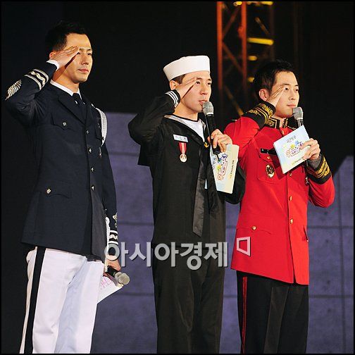 [일산(경기) = 아시아경제 박성기 기자]배우 조인성, 방송인 붐(이민호), 배우 김재원이 5일 오후 7시 경기도 일산 KINTEX에서 진행된 KFN(국군방송) '연예병사 파워콘서트'에서 경례를 하고 있다. 박성기 기자 musictok@asiae.co.kr<ⓒ아시아경제 & 스투닷컴(stoo.com)이 만드는 온오프라인 연예뉴스>