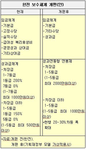 [아시아경제 이경호 기자] 한국전력이 2년 연속 적자를 기록한데 대해 수익성 확보차원에서 강도높은 자구책을 추진한다. 우선 기존 임금체계에 성과와 보상을 대폭 강화한 성과연동 연봉제를 도입키로 했다. 이에 따라 한전 처장급은 최대 2000만원 이상, 일반 직원들도 1000만원 이내의 성과급이 차등 지급될 것으로 보인다. 15일 한전에 따르면 김쌍수 한전 사장은 지난 12일 서울 삼성동 한전 본사에서 열린 주주총회에서 "수익성과 효율성을 중심으로 내부 경쟁을 강화하고, 성과에 따른 책임과 보상을 명확히 하겠다"면서 "급여 체계를 성과연동 연봉제로 전환할 계획이며, 기업 문화도 혁신지향적으로 바꾸겠다"고 밝혔다. 한전은 2007년말 호봉제에서 연봉제로 전환했으며 기본 연봉에 더해 처장급, 차장급 이하와 직원들은 7단계에서 5단계로 성과급을 차등 지급받았다. 한전은 2008년 근속연수 17년 기준 1인당 평균 1745만7000원의 경영성과 상여금을 받았다. 기획재정부는 현재 연봉체계를 현재(기본급 고정수당 실적수당 복리후생비 경영성과 상여금 기타상여금)을 기본연봉, 성과연봉, 기타수당으로 단순화하기로 했다. 또한 공공기관 전체 직원들을 성과에 따라 5등급으로 분류하고 1등급과 5등급 직원의 연봉 격차를 20%로 확대하기로 했다. 이 제도가 적용될 경우 한전은 기본연봉에 성과급체계도 5단계로 일률 적용되고 성과급 차등지급폭도 더욱 확대된다. 처장급의 경우 현재 100%를 기준으로 1등급인 A등급은 200%를 받고 B,C,D에 따라 차등되며 최하위인 G등급은 0%를 받는다. 차장급 이하 과장급은 75%를 기준으로 5단계를 적용받아 1등급은 150%, 5등급은 0%를 받는다. 최상위와 최하위 등급간 성과급차이는 처장급은 1000만원, 차장급 이하는 500만원 안팎으로 알려졌다. 재정부 가이드라인대로 이 지급폭이 20, 30%까지 확대되고 5단계로 통일화될 경우 기본성과급(현재 100%) 기준과 차등폭도 확대된다. 현재로서는 정확한 모델이 나오지 않았으나 처장급은 2000만원 이상, 차장급 이하는 1000만원 이내로 차이가 날 것으로 예상된다.한전 이사들도 이날 주총에서 경영적자에 따라 이사 보수한도를 20억7400만원에서 19억2700만원으로 삭감키로 했다. 이번 결정으로 한전의 상임이사 7명과 사외이사 8명의 보수한도 총액은 2년 연속 삭감됐다. 활동비를 받는 사외이사를 제외한 상임이사 1인당 보수한도는 2억3200만원으로 줄었다.김쌍수 사장은 "(작년 6월 전기요금 인상과 내부경비절감 등의) 노력을 통해 2008년 약 3조원에 이르던 적자 폭을 대폭 축소했으나 연료비 부담 등 대외 경영여건 악화로 2년 연속 적자를 면하지는 못했다"면서 2년 연속 주주들에게 배당하지 못한 점을 사과하고 "흑자경영을 통해 주주배당이 가능하도록 지속적인 자구노력과 신규 수익원 창출에 최선을 다하겠다"고 했다.김쌍수 사장은 올해 주요 경영전략으로 ▲2011년 하반기 연료비연동제 대비 ▲발전연료 자주개발률 50% 조기달성 ▲송배전 EPC(설계,구매,시공)사업 진출 ▲스마트그리드 표준화 ▲전기자동차 충전 인프라구축 등 8대 녹색기술 조기 확보 등을 추진하겠다고 했다. 김 사장은 "이 같은 노력을 통해 10년 후 One-KEPCO 브랜드 하에 국내에서는 전력 판매와 발전을 하는 사업단위로, 해외에서는 원전 수출, 원전 운영 및 유지·보수, 자원개발, 수·화력 발전, 스마트그리드 등 다각적인 사업 단위로 글로벌비즈니스를 전개하게 될 것"이라며 글로벌 톱 5 유틸리티社로의 포부를 밝혔다.