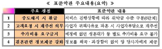 [아시아경제 김진우 기자]앞으로 국제결혼이 성사될 경우 예정에 없던 성혼대가 등 별도의 추가비용을 요구할 수 없게 된다. 또 사업자 귀책사유로 파혼될 경우 사업자는 무료로 결혼을 재주선해야 한다.공정거래위원회는 국제결혼 중개서비스를 이용하는 고객들의 정당한 권익을 보호하고, 공정한 거래질서 확립을 위해 이같은 내용을 담은 '국제결혼중개 표준약관'을 제정해 보급했다고 15일 밝혔다.표준약관은 이와 함께 고객의 중도해지에 따른 환급금 기준을 마련했다. 지금까지 사업자는 고객의 중도해지 여부와 관계없이 고객이 납부한 비용은 환불하지 않거나, 비용정산 후 나머지 금액을 환급했다.그러나 앞으로는 중개서비스 제공단계에 따라 총비용에서 일정 비율의 위약금을 공제한 나머지 금액을 고객에게 환급해야 한다. 또 고객의 일방적인 계약해지에 따른 책임정도와 사업자의 합리적인 이익보장 등을 종합적으로 감안해 위약금 산정기준이 마련됐다.아울러 국제결혼 중개업자는 정보를 왜곡 및 과장함이 없이 양 당사자에게 제공해야 하는 등 결혼관련 정보제공 의무가 강화됐다.국제결혼은 2008년 기준으로 우리나라 총 결혼건수(32만7715건)의 11%(3만6204건)를 차지하고 있으며, 지난해 12월말 현재 등록된 국제결혼중개업자 수는 전국적으로 총 1237개다.한국소비자원에 접수된 관련 소비자 상담건수는 2007년 72건, 2008년 137건, 2009년 176건이었다.이 가운데 고객의 중도해지 요구 시 사업자의 환급금 지급 거부가 21.7%로 가장 많았으며, 외국인 배우자 입국 후 가출 및 이혼 요구(18.3%), 결혼중개업자의 추가비용 요구(12.7%) 등이 있었다.공정위 관계자는 "국제결혼 중개업자와 고객 간의 권리·의무 및 책임관계를 명확히 규정해 고객들이 안심하고 국제결혼 중개서비스를 이용할 수 있는 여건을 마련했다"고 말했다.