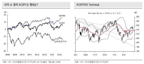 [아시아경제 김지은 기자] 국내증시가 미국과 중국의 갈림길에 놓여있다. 2009년 이후 최고점 경신을 시도하고 있는 미국 S&P500 지수와 주요 지지대인 3000선을 이탈한 중국 상해종합지수 사이에서 어느 쪽으로 향할지 방향을 잃은 모습이다. 잘 흘러가던 국내증시를 혼란스럽게 만든 것은 이 두 나라의 리스크다. 미국의 경우 금융개혁법안 관련 이슈가 다시 고개를 들기 시작했고 중국은 모건스탠리 등이 추가 지준율 인상 가능성을 점치며 긴축 이슈가 불거졌다. 국내증시가 가장 민감하게 반응하는 미국과 중국 두 나라에서 일제히 악재성 이슈가 터져 나왔으니 잘 나가던 국내증시에 브레이크가 걸릴만 한 상황이다. 하지만 브레이크가 걸렸다고 해서 오르막길을 올라가던 자동차가 내리막길로 방향을 트는 것은 아니다. 재차 시동을 걸어 다시 올라가면 문제될 것은 없다. 국내증시에서 고개를 들고 있는 불안감 역시 곰곰이 살펴보면 그리 두려운 존재만은 아니다. 먼저 금융개혁법안의 경우 전날 미 투자자들은 오히려 불확실성 해소로 받아들였다는 점을 기억할 필요가 있다. 금융개혁법안의 영향을 가장 크게 받는 은행주의 경우 전날 반등에 성공하며 거래를 마감했다. 크리스토퍼 도드 미 상원의원이 금융개혁안을 공개하면서 오히려 금융개혁에 대한 신뢰를 가질 수 있었던 것. 금융개혁안이 새롭지 않다는 것은 알게 된 투자자들이 안도하면서 미 증시가 막판 반등에 성공했던 것이다. 중국의 긴축 우려 역시 과연 주가하락 요인인지 고민해볼 필요가 있다. 원자바오 총리가 금리인상이 당분간 없다고 못을 박은 상황에서 중국이 당장 긴축에 나설 가능성은 극히 미미하다. 또 설령 긴축에 나선다 하더라도 이것이 주가 하락으로 연결될 수 있을지도 의문이다. 긴축 이슈가 다시 고개를 든 것은 중국의 2월 소비자물가지수(CPI)가 예상치를 상회했기 때문인데, CPI를 끌어올린 것은 식료품 가격의 급등이고 이것은 일시적인 현상에 불과하다는 것이 대체적인 평가다. 긴축에 나설만한 상황이 아니라는 뜻이다. 더욱이 중국이 본격적인 긴축에 나섰던 2004년부터 2007년 말까지 중국 상해종합주가지수는 1000에서 6000포인트 부근까지 오히려 상승했다는 점을 기억한다면 금리인상이 주가 하락으로 연결된다는 공식은 성립하지 않는다. 국내증시에서도 전날 외국인이 선물시장에서 대거 매도에 나섰지만 국내증시에 대한 스탠스가 바뀌었다고 보기는 어렵다. 현물시장에서는 강도가 약해지긴 했지만 매수세를 이어가고 있는 만큼 외국인들 내에서도 의견이 엇갈리고 있는 정도로 해석할 수 있다. FOMC 등 대형 이벤트를 앞두고 거래대금이 크게 감소하는 등 관망세가 뚜렷한 상황에서 심리적인 요인이 작용했던 것인 만큼 외국인의 스탠스 변화를 우려하기에는 조금 이른 시점이다. 오히려 외국인의 약세 포지션이 급증했음에도 불구하고 차익거래가 큰 영향을 받지 않았다는 점을 기억할 필요가 있다. 평균 베이시스는 30bp 가까운 하락세를 기록했지만 차익거래 중립구간을 크게 벗어나지 않았고 오히려 비차익 거래에서는 19일째 매수 우위를 지속하는 모습도 나타났다. 시장 내 근본적인 변화가 나타난 것이 아닌만큼 지나치게 두려워할 필요는 없어 보인다.
