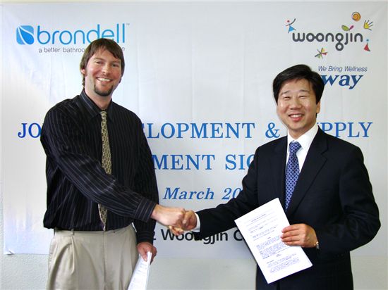 17일(미국 현지시간 16일 오후4시) 미국 샌프란시스코 Brondell(브론델)사 사무실에서 웅진코웨이 이인찬 해외영업본부장(오른쪽)이 Brondell사의 Steven Scheer(스티븐 쉬어) 사장과 3년간 비데를 개발·공급 하기로 한 계약서에 싸인을 하고 활짝 웃고 있다.