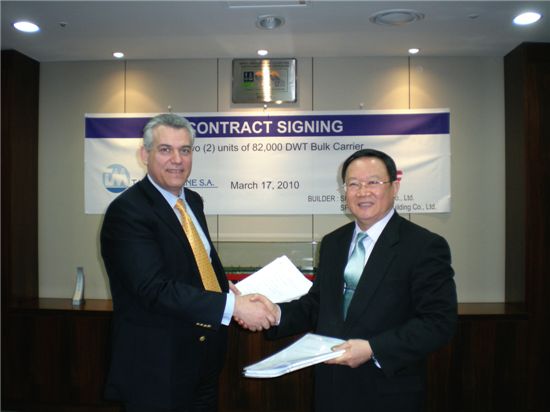 김인동 SPP해양조선 사장(오른쪽)과 디미트리오스 헬리오티스 타겟마린 사장이 선박 건조 계약서를 교환한 후 악수하고 있다.