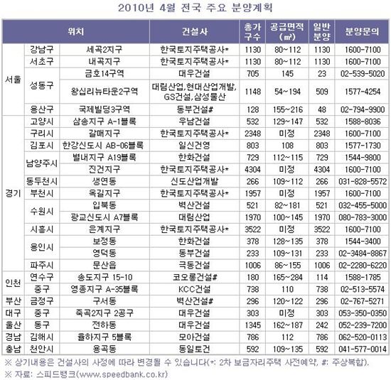 [아시아경제 오진희 기자]다음달 전국분양시장은 분양 성수기인 봄철임에도 민간 건설업체의 신규공급이 크게 위축되는 모습이다. 이는 올 3월 위례신도시와 4월 보금자리주택 2차지구 사전예약에 청약자들의 관심이 온통 쏠리고 있기 때문이다. 21일 부동산정보업체 스피드뱅크에 따르면 4월 한 달간 전국 47개 사업장에서 총 3만6826가구 중 3만3766가구가 일반분양 될 예정이다. 분양예정물량이 3만448가구였던 지난 달보다 소폭 증가했다. 하지만 2차 보금자리지구 사전예약 물량 1만4391가구가 포함돼 이를 제외하면 실질적으로는 2만 가구에도 미치지 못한 것으로 조사됐다.지역별 예정물량을 살펴보면 ▲경기(2만5698가구) ▲서울(2949가구) ▲인천(1496가구) ▲대구(1444가구) ▲경남(786가구) ▲충남(592가구) ▲울산(505가구) ▲부산(296가구) 순으로 많다.◆서울, 2차보금자리, 금호14구역, 왕십리뉴타운2구역 등= 한국토지주택공사(LH)는 오는 4월 세곡2지구와 내곡지구에서 보금자리주택 사전예약을 실시할 예정이다. 두 곳 모두 1130가구씩 일반분양되며 공급면적 80~112㎡로 구성된다.세고2지구는 분당-수서고속화도로를 사이에 두고 위례신도시와 인접하며 좌측으로 1차 보금자리지구인 세곡지구와 맞닿아 있다. 세곡지구보다 지하철 3호선 수서역이 가깝고 8호선 문정역도 이용 가능하다. 동남권유통단지인 '가든파이브'가 가깝고 문정 법조단지 개발이 예정돼 있다.내곡지구 주변으로는 1차 보금자리지구인 우면지구와 청계산이 근접하다. 또 경부고속도로 양재IC가 가깝고 과천~우면산 도로, 분당~내곡 고속화도로, 강남순환도시고속도로 등의 이용이 편리하다. 내년 신분당선 청계역이 개통예정이다.대우건설도 내달쯤 성동구 금호14구역에서 '푸르지오'를 분양할 예정이다. 총 705가구가 건립되며 이 중 공급면적 145㎡의 23가구가 일반분양 될 예정이다. GS건설·대림산업·삼성물산·현대산업개발이 시공하는 왕십리뉴타운2구역의 분양을 앞두고 있다. 상왕십리동 일대에 위치하며 총 1148가구 중 509가구(공급면적 54~194㎡)가 일반분양된다. 동부건설은 용산구 한강로2가 일대 국제빌딩3구역을 재개발해 4월쯤 주상복합단지를 분양할 예정이다. 총 128가구 중 48가구(공급면적 155~216㎡)가 일반공급된다. ◆경기, 삼송지구, 한강신도시, 진건지구 등= 경기지역에서는 2차보금자리인 남양주 진건지구에 LH가 보금자리 사전예약을 실시한다. 총 4304가구가 일반분양된다.민간분양으로는 우남건설은 삼송지구 A-1블록에, 일신건영이 김포한강신도시 AB-06블록에 각각 532가구, 803가구씩 일반공급에 나선다. '고양삼송 우남퍼스트빌 1차'는 129~147㎡의 중대형 아파트로, 일신건영의 '휴먼빌'은 공급면적 108㎡인 단일면적으로 구성됐다.수원 광교신도시 A7블록에는 대림산업이 100~145㎡으로 구성된 1970가구 대단지인 'e편한세상'의 청약을 개시한다. 또 용인 영덕동에서 동부건설이 공급면적 109~131㎡의 중대형 아파트 '센트레빌' 233가구를 일반에 공급한다.◆인천, 송도와 영종= 코오롱건설은 인천 송도지구 15-10번지 일원에서 주상복합아파트를 공급할 계획이다. 총 180가구 중 114가구가 일반분양되고, 공급면적은 165~284㎡의 대형 위주다. KCC건설은 인천 영종지구 A-35블록에 총 738가구를 일반분양하며 주택형은 공급면적 기준 110㎡ 단일형이다.◆지방, 부산 울산 등= 벽산건설은 부산 금정구 구서동에서 주상복합아파트인 ‘블루밍 타워’를 선보일 전망이다. 공급면적 120~122㎡로 구성되며 총 296가구가 일반에 공급된다. 대우건설은 울산 동구 전하동 일산아파트3지구를 재건축한 ‘울산전하푸르지오’의 분양에 나선다. 지난 해 6월 중소형 428가구 공급에 이어 오는 3월에는 공급면적 162~187㎡의 중대형 242가구가 공급될 예정이다. 최고 28층, 16개 동 규모로 총 1345가구의 대단지로 건립된다. 오진희 기자 valere@asiae.co.kr<ⓒ세계를 보는 창 경제를 보는 눈, 아시아경제(www.asiae.co.kr) 무단전재 배포금지>