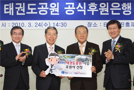 기업은행과 태권도진흥재단은 24일 오후 서울 기업은행 본점에서 태권도공원 공식후원은행 협약을 맺었다(왼쪽 두번째 윤용로 기업은행장, 왼쪽 세번째 이대순 태권도진흥재단 이사장).