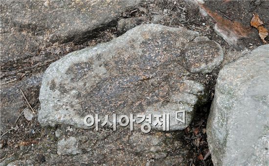 [아시아경제 조용준 기자]거인이 찍어놓은 발바닥일까? 전남 영암에 있는 월출산 등산로에 발바닥 모양을 닮은 바위가 있어 눈길을 끌고 있다. 천황사지에서 바람폭포, 구름다리 코스의 등산로에 있는 발바닥바위는 오른발 모양을 띠고 있으며 엄지발가락과 네개의 발가락이 선명하게 남아 있어 이채롭다. 발바닥 바위는 등산로 바닥에 있기에 신경쓰지 않고 지나다보면 찾기는 쉽지 않다. 월출산은 기암괴석으로 이뤄진 산으로 해발은 809m로 그리 높지 않지만 기암괴석과 암봉들로 이뤄져 있어 호남의 소금강으로 불리는 명산이다.