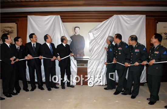 [아시아경제 양낙규 기자]안중근 의사 순국 100주년을 맞아 충남 계룡대 육군본부에 '안중근 장군실'이 마련됐다.육군은 국민적 영웅으로 추앙받고 있는 안중근 의사를 군에서는 '군인정신의 표상'으로 삼아 계승하기 위해 25일 안중근 장군실 개관식을 개최했다고 26일 밝혔다. 이날 개관식에는 육군참모총장을 비롯한 김주현 독립기념관장, 김호일 안중근 기념관장, 남만우 광복회 부회장, 안주섭 전 보훈처장, 육군 장군단이 참석한 가운데 개최됐다.장군실에는 안중근 의사의 일대기와 무장투쟁활동, 하얼빈 의거상황, 사형 집행을 앞두고 마지막으로 쓴 유묵 '위국헌신 군인본분(爲國獻身 軍人本分)', '임적선진 위장의무(臨敵先進 爲將義務)' 등이 전시됐다.한민구 총장은 개관식에서 "대한의군 참모중장으로서 적장을 포살한 것이니, 육전 포로에 관한 만국공법에 의해 전쟁포로로서 대우해줄 것을 줄기차게 요구한 안중근 의사를 군인정신의 사표, 군인의 표상으로 길이 계승하기 위해 안중근 장군실로 명명하게 됐다"고 말했다.한편 육군은 지난 2005년 3월에 6.25전쟁의 영웅 '백선엽 장군실'을 육군본부에 개관한 바 있다.양낙규 기자 if@asiae.co.kr<ⓒ세계를 보는 창 경제를 보는 눈, 아시아경제(www.asiae.co.kr) 무단전재 배포금지>