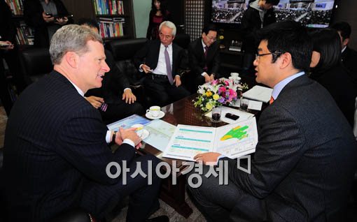 [아시아경제 윤동주 기자] 세계적인 명문 록펠러가의 5대손인 스티븐 C. 록펠러 주니어 리-에코홀딩스 회장이 26일 오전 서울 충무로 아시아미디어타워를 방문, IS동서그룹 관계자들과 의견을 나누고 있다.윤동주 기자 doso7@asiae.co.kr<ⓒ세계를 보는 창 경제를 보는 눈, 아시아경제(www.asiae.co.kr) 무단전재 배포금지>