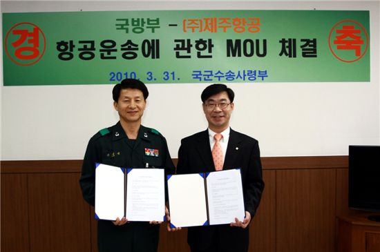 국군수송사령관 이계성 준장(왼쪽)과 제주항공 영업운송본부장 엄부영 상무(오른쪽)가 지난달 31일 국방부와 제주항공의 군 항공운송에 관한 양해각서를 체결했다.
