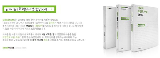 [아시아경제 김철현 기자]NHN(대표 김상헌)은 네이버가 지난해 네티즌들이 매일 검색했던 검색결과를 모아 한 해의 트렌드를 파악할 수 있는 '네이버 트렌드 연감 2009'를 출간했다고 2일 밝혔다.2007년부터 3년째 선보이고 있는 '네이버 트렌드 연감'은 1위부터 1만위까지의 통합 검색어를 바탕으로 인물, 생활, 경제, 엔터테인먼트, 쇼핑, 건강 등 총 15개 분야에서 각 분야 상위 검색어를 보여준다.네이버 트렌드 연감에 따르면 지난해 네티즌들이 가장 많이 검색했던 인기 검색어는 '꽃보다 남자', '소녀시대', '선덕여왕', '2PM', '김연아', '장자연', '마이클잭슨', '노무현' 등으로 나타났다. 분야별 인기검색어를 살펴보면 영화에서는 '해운대'가 1위를 차지했고, 드라마에서는 '꽃보다 남자', '오락 프로그램으로는 '무한도전', 게임에서는 '서든어택'이 꼽혔다. 가수 중 인기검색어 1위는 '소녀시대'로 나타났고, 방송인은 '유재석', 스포츠스타는 '김연아'가 검색어 1위였다. 특히 '네이버 트렌드 연감 2009'는 1년 365일 3시간 단위로 최고 인기검색어를 집계해 네티즌들의 관심사를 시간의 흐름에 따라 정리했으며, 2008년 검색어 순위와의 비교를 통해 2년간 검색 트렌드와 관심사의 변화를 보여주고 있다. '네이버 트렌드 연감 2009'는 네이버 검색창에서 '네이버 트렌드'를 입력하거나, 온라인 페이지()에 방문하면 전체 내용을 무료로 볼 수 있다. 소장을 원하는 이들을 위해 온·오프라인 서점에서 판매도 되고 있다. NHN 조수용 CMD본부장은 "검색은 일회성 행위지만, 집적된 검색어 모음을 책자로 발간하면 오늘날을 기록하는 생생한 기록물이 된다"며, "이번 연감은 3400만명 네티즌들이 네이버 검색창을 통해 검색한 키워드 통계로, 동시대를 살아가는 사람들의 관심, 시각의 '흐름'을 장기적으로 바라볼 수 있는 의미 있는 사회학적 도구가 될 것"이라고 소개했다. 김철현 기자 kch@asiae.co.kr<ⓒ세계를 보는 창 경제를 보는 눈, 아시아경제(www.asiae.co.kr) 무단전재 배포금지>