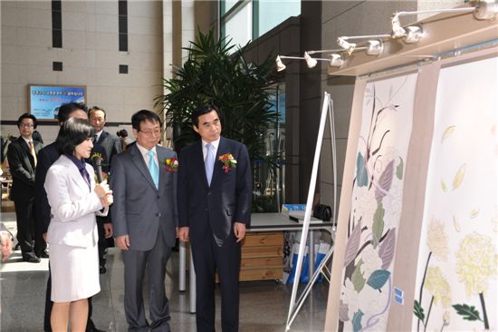 문병권 중랑구청장이 디자인 작품 전시회를 둘러보고 있다.