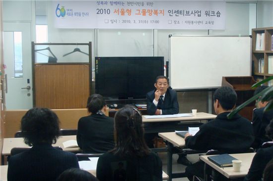성북구가 새로운 서울형 그물망 복지 체제를 통해 복지사각지대를 최소화하고 복지 영역도 확장한다. 사진은 지난달 31일 성북구청 내 자원봉사센터 교육장에서 열린 '서울형 그물망 복지 관련 워크숍'에서 관계 공무원들이 효율적인 운용방안에 관해 토론을 벌이고 있는 모습.<br />