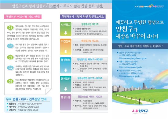 [아시아경제 박종일 기자]양천구가 주민 섬기는 청렴행정을 적극 펼친다.양천구(구청장 추재엽)는 이의 제기가 어렵다는 구민 고객의 인식 개선을 위해 행정처분 이의신청 제출 절차·방법, 행정처분 시 구민이 꼭 알아야 할 주요 내용, 부조리 신고 방법 등 업무처리 절차에 대해 '투명성과 이의신청절차' 안내문을 제작, 내방 민원인에게 배부한다.3단 리플릿의 형태로 만들어 질 안내문 주요 내용은 ▲사전통지 의견청취 행정처분 행정심판 행정소송 등 구민 고객이 알아야 할 행정처분 이의신청제도 ▲영업정지 자격정지 이행강제금 과징금 과태료 부과 처분에 따른 사전 고지제도 청문 의견 진술 이의신청 등에 대한 행정처분 시 처분 상대방이 확인 할 주요 내용 ▲ 양천구와 외부기관의 부조리 신고제도, 비리신고 시 조사 절차 등을 담고 있다.양천구는 구민고객에게 이들 내용을 상세히 안내함으로써 업무처리 투명성과 행정 신뢰도를 더욱 높일 것으로 기대하고 있다.