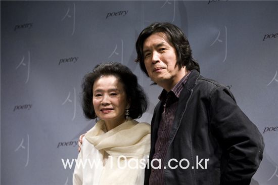 "Did you go easy on me on purpose because you didn't want me to have a tough time?" "Do I look like I'm that nice of a guy?" This was the dialogue between the main star and director of film "Poetry" as seen in video containing behind-the-scenes footage revealed at a press conference on April 14. And the two were none other than Yoon Jung-hee, who had been in a 15-year hiatus after having appeared in over 300 films during 40 years of her career and director Lee Chang-dong, who has made Korean film history starting from "Green Fish" to "Secret Sunshine." Below are excerpts from the press conference held at a CJ CGV theater emceed by actor Ahn Nae-sang.Q: How did you come about making "Poetry"?Lee Chang-dong: "Poetry" was both a challenge and experiment for me, as was any other movie that I've worked on in the past. I wondered how well I would be able to pull off the challenge this time. And I wanted to share the meaningful and beautiful things that we don't see with our eyes but have been disappearing due to the social conditions of the times. That's why I decided to present my audience with a film with such a title, story and main character.Ahn Nae-sang: The director doesn't seem to have been too concerned with the film's commercial success. (laugh) But don't you still think it'll do okay? Lee: I've received that sort of question everytime I make a film. When I did "Oasis," someone asked me if I thought anyone would go all the way to a theater to watch a film about the disabled. I make movies because of my desire to communicate with the audience. That is what films should be about -- it's not just a medium of communication for people who understand each other. I want to be able to meet and communicate with the general mass. I have faith that I will be able to do so if I succeed in delivering the truth.Actress Yoon Jung-hee [Chae Ki-won/10Asia]