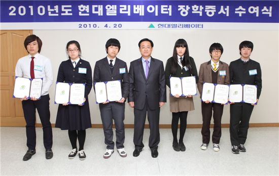 [아시아경제 손현진 기자]현대엘리베이터가 매칭그랜트 장학생을 선발하여 지역 인재 육성을 위한 사회공헌 활동을 펼쳤다.현대엘리베이터는 21일 모범적인 학교생활을 하고 있는 이천 지역 학생 7명을 대상으로 이천 본사에서 끝전공제 매칭그랜트 장학금(총 700만원) 전달식을 가졌다. 끝전공제 매칭그랜트는 매달 임직원의 월급에서 1000원이하 금액을 모으는 기금과 동일한 액수의 후원금을 회사측에서 출연하는 제도다.이 날 장학증서를 전달한 송진철 사장은 "학생들이 학업에 더욱 정진해 사회에 필요한 사람으로 성장하여 지역 사회 발전에 이바지 해 줄 것"을 당부했다. 현대엘리베이터는 "앞으로도 지역 인재를 육성하는데 지속적인 관심을 가지고 지원을 아끼지 않을 계획"이라면서 "적립금에 따라 매년 매칭그랜트 장학금 수혜 학생 수를 늘려가도록 하겠다"고 말했다. 한편 현대엘리베이터는 1997년부터 시행해 오던 끝전공제 제도를 지난해부터 매칭그랜트 방식과 연계해 여기서 조성된 기금의 50%를 장학금으로 지급해 오고 있다. 현대엘리베이터는 끝전공제 매칭그랜트 장학사업 외에도 환경 정화 활동, 이천 도자기 축제 지원, 농촌 일손 돕기, 연탄 배달 봉사, 관내 복지시설 지원 등 지역 사회를 대상으로 한 다양한 사회공헌활동을 전개해 오고 있다.손현진 기자 everwhite@<ⓒ세계를 보는 창 경제를 보는 눈, 아시아경제(www.asiae.co.kr) 무단전재 배포금지>