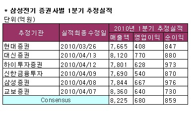 [아시아경제 박선미 기자]삼성전기가 올해 1분기 비수기임에도 불구하고 어닝 서프라이즈를 기대할 수 있을 것으로 전망됐다. 2분기 실적 모멘텀도 강해서 올해 실적은 1분기부터 우상향 추세를 나타낼 것이라는 목소리가 지배적이다.22일 금융정보업체인 에프앤가이드에 따르면 국내 18개 증권사의 삼성전기 1분기 추정실적(본사기준) 컨센서스는 매출액 8225억원, 영업이익 680억원, 당기순이익 859억원으로 집계됐다. 연결기준 매출액과 영업이익 컨센서스는 각각 1조5390억원과 1350억원.현대증권은 "1분기에도 어닝 서프라이즈를 기대할 수 있다"며 삼성전기 연결기준 실적을 매출액 1조5400억원, 영업이익 1217억원으로 예상했다. 김유철 애널리스트는 "400억원 수준의 1회성 비용이 반영된 전후를 가정한 것으로, 실질적으로는 영업이익이 1600억원을 넘는 어닝 서프라이즈를 보일 것"이라고 설명했다.대신증권은 삼성전기 1분기 영업이익을 1248억원(1회성 비용 반영·연결기준)으로 추정하며 2분기 1977억원, 3분기 2404억원, 4분기 2267억원으로 그 규모가 점차 확대될 것이라고 진단했다.박강호, 김록호 애널리스트는 "1분기부터 LED 매출이 급증하고 있다"며 "올해 1분기의 LED 매출은 3011억원으로 예상하며 분기기준 처음 3000억원을 상회한 것으로 추정된다"고 설명했다. 그는 또 "2분기에 3734억원, 3분기 4600억원, 4분기 5248억원으로 LED 매출이 증가할 전망"이라며 "LED는 삼성전자의 LED TV 판매 호조에 힘입어 폭발적인 성장세를 시현할 것으로 분석된다"고 덧붙였다.삼성전기는 적층세라믹콘덴서(MLCC), 발광다이오드(LED) 반도체 패키지용 기판(BGA) 삼각 축이 실적에 강하게 성장 동력을 제공하고 있다. 또 계절성이 강한 삼성전기의 분기별 실적 변동성도 크게 줄어드는 추세다.권성률 한국투자증권 애널리스트는 "1분기에는 MLCC가 일을 낸다면 2분기에는 LED에서 조명용 매출이 본격화되면서 대폭 매출 증가가 기대되고 3분기에는 안정화 작업이 완료되는 HDI, 제품믹스 개선이 기대되는 BGA 등 기판 사업부가 실적의 새로운 축으로 떠오를 전망"이라고 밝혔다.그는 "2분기는 MLCC, LED BGA 삼각 축의 고른 활약으로 2000억원대 영업이익에 가뿐히 진입할 전망"이라며 "올해 연간 영업이익은 8564억원으로 지난해 대비 80% 이상 증가할 것"이라고 전했다.오세준 한화증권 애널리스트도 "주 고객사인 삼성전자의 LED TV출하량이 전년대비 4배 이상 증가할 것으로 추정돼 LED 부문의 외형성장이 확대될 전망"이라며 "또 지난해 보다 20% 성장한 6조원 규모로 예상되는 MLCC시장에서 삼성전기는 4000억원 규모의 설비 증설로 시장 지배력을 확대할 것으로 기대된다"고 조언했다.박선미 기자 psm82@<ⓒ세계를 보는 창 경제를 보는 눈, 아시아경제(www.asiae.co.kr) 무단전재 배포금지>