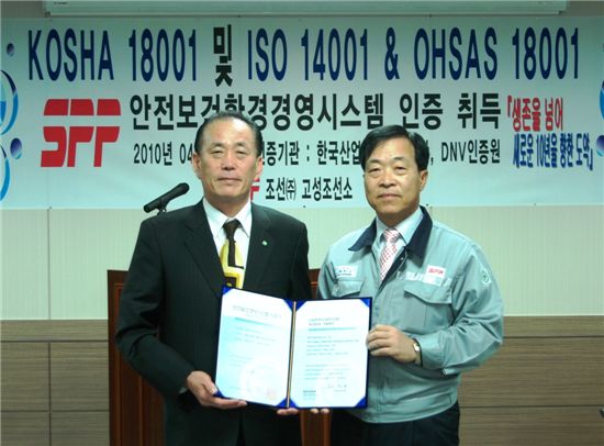 [아시아경제 채명석 기자] SPP그룹 전 조선소가 환경안전경영인증을 획득했다.SPP에 따르면 고성조선소는 한국산업안전보건공단으로부터 KOSHA 18001(안전보건경영시스템) 인증과, 노르웨이의 국제인증기관인 DNV로부터 OHSAS18001(안전보건경영시스템), ISO14001(환경경영시스템) 인증을 획득했다.지난 2007년 8월 SPP조선의 통영조선소, 2009년 2월 SPP해양조선의 사천조선소가 DNV인증원으로부터 OHSAS18001, ISO14001을 인증 받은데 이어 2008년 5월 생산을 개시한 고성조선소의 이번 인증으로, SPP의 모든 조선소가 세계적인 환경 및 안전보건경영시스템을 갖춘 것을 인정받았다.22일 열린 인증서 수여식에는 안인균 DNV인증원장, 박덕곤 한국산업안전보건공단 경남지도원장, 곽한정 SPP조선 대표이사를 비롯한 관계자들이 참석했다.안전보건경영시스템 인증제도는 사업주가 자율적으로 안전보건경영체제를 구축하고 주기적으로 계획, 실행, 점검, 개선 순으로 체계적인 안전활동이 이뤄지는지를 평가한 후 기준에 맞으면 인증사업장으로 지정하는 제도다.KOSHA 18001은 산업안전보건법을 근간으로 국내기준에 맞게 세부적으로 짜여진 안전보건경영시스템 규격이며, OHSAS 18001은 각국의 표준화 및 인증기관들이 규격을 공동으로 제정하여 현재 국제적으로 통용력을 갖는 안전보건경영시스템 규격이다.채명석 기자 oricms@<ⓒ세계를 보는 창 경제를 보는 눈, 아시아경제(www.asiae.co.kr) 무단전재 배포금지>