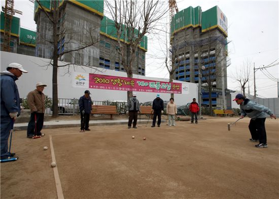 생활체육교실 중 게이트볼교실에서 게이트볼을 즐기는 어르신들의 모습.<br />