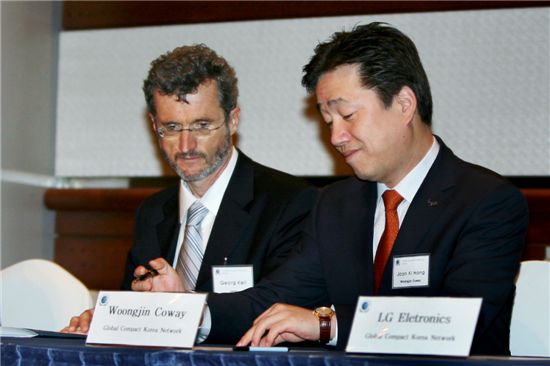 23일 홍준기 웅진코웨이 대표(오른쪽)가 글로벌 기업의 사회적 책임을 규정한 국제협약인 유엔글로벌콤팩트(UN Global Compact, UNGC)의 최고경영자 수자원관리 책무(CEO Water Mandate)에 가입하고 있다.