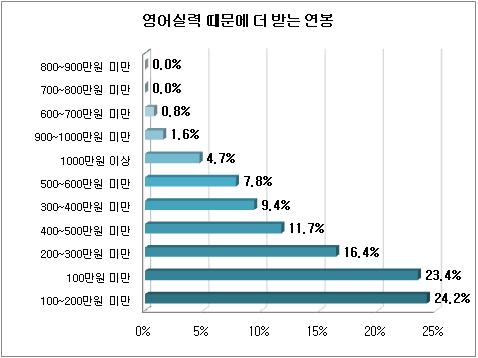 [아시아경제 오현길 기자]영어 실력이 좋으면 더 많은 연봉을 받는 것으로 조사됐다.사람인(대표 이정근)이 국내 인사담당자 370명을 대상으로 조사한 결과, 응답자 가운데 34.6%가 우수한 영어 실력으로 연봉을 더 받는 직원이 있다고 답했다.또 이들 가운데 46%는 영어 실력이 승진에 유리한 영향을 준다고 답해, 높은 연봉과 빠른 승진에 영어 실력이 필수가 되고 있는 것으로 나타났다.영어 실력이 뛰어난 직원이 일반 직원보다 더 받는 연봉은 평균 301만원이며, 400만원~5000만원을 받는 직원도 11.7%로 조사됐다.영어 실력을 평가하는 방법으로는 토익, 토플 등 공인어학성적 제출(41.8% 복수응답), 영어 회의 및 메일 공유(25.3%), 영어회화 면접 진행(18.8%), 자체 영어시험(9.4%) 순으로 집계됐다.관련기사오현길 기자 ohk0414@<ⓒ세계를 보는 창 경제를 보는 눈, 아시아경제(www.asiae.co.kr) 무단전재 배포금지>