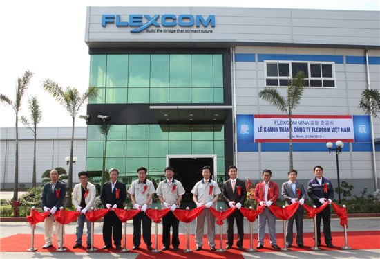 하경태 플렉스컴 대표(오른쪽에서 다섯번째) 등 관계자들이 21일 베트남 하노이 박린성에서 플렉스컴 비나의 공장 준공식 기념촬영을 하고 있는 모습.